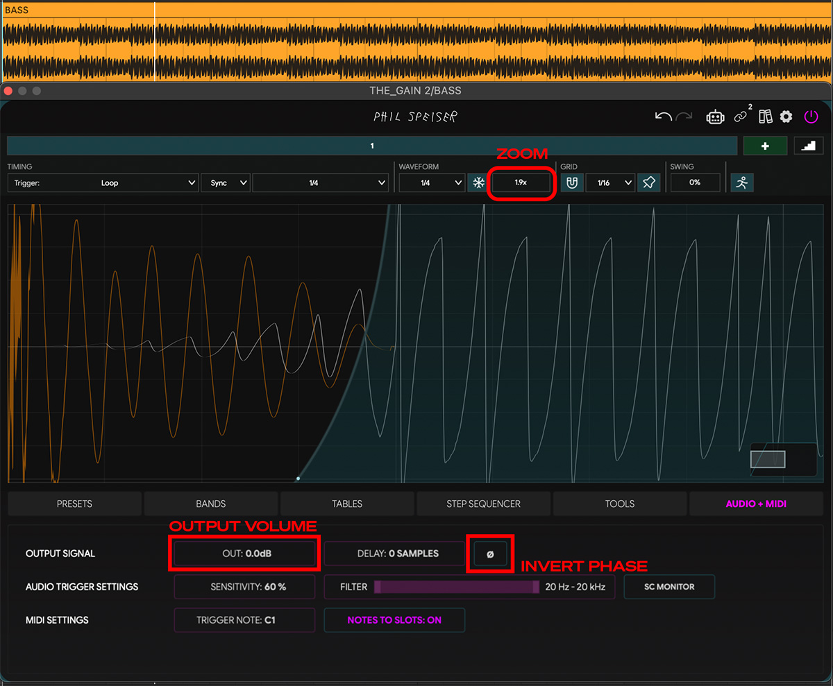 Use the OUT slider to adjust the final volume of the bass. Aim for the bass waveform to sit at a height very close to the peak of the kick.